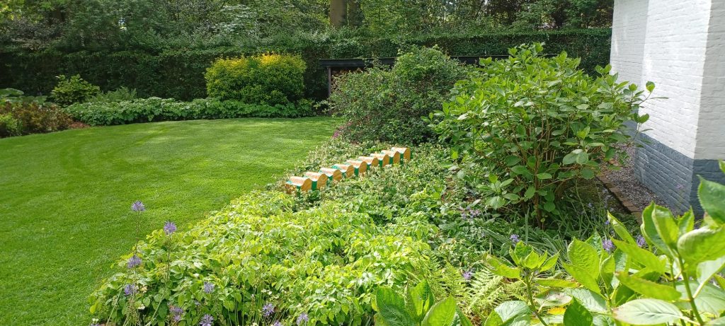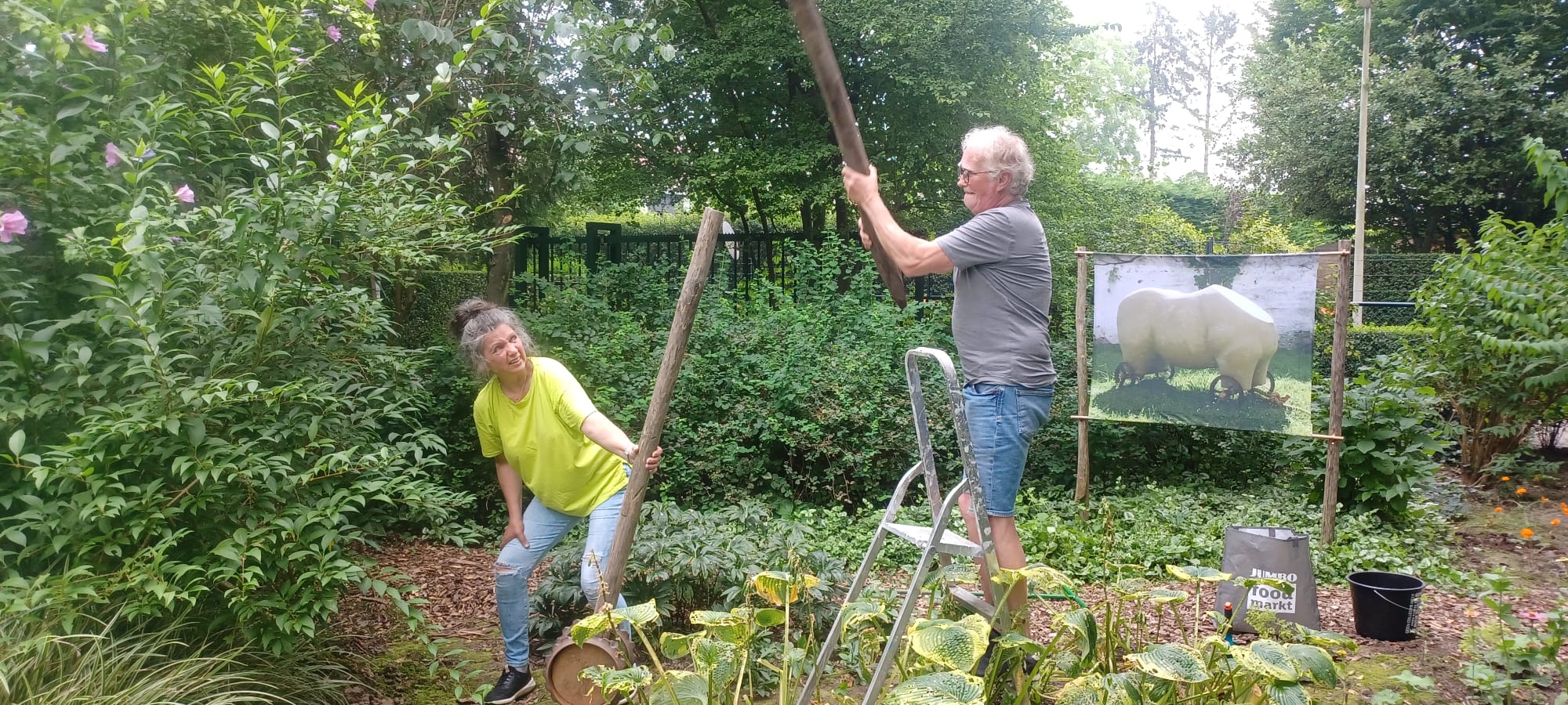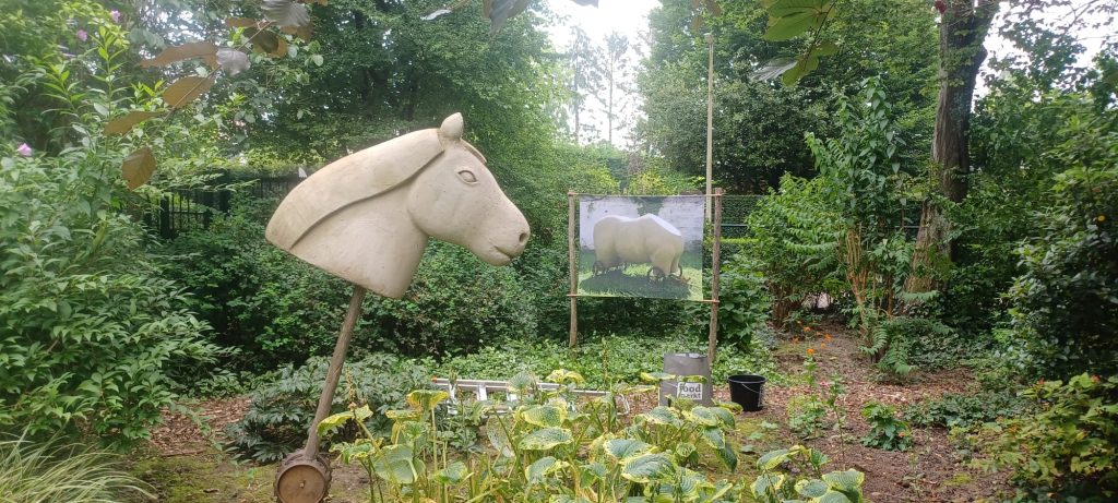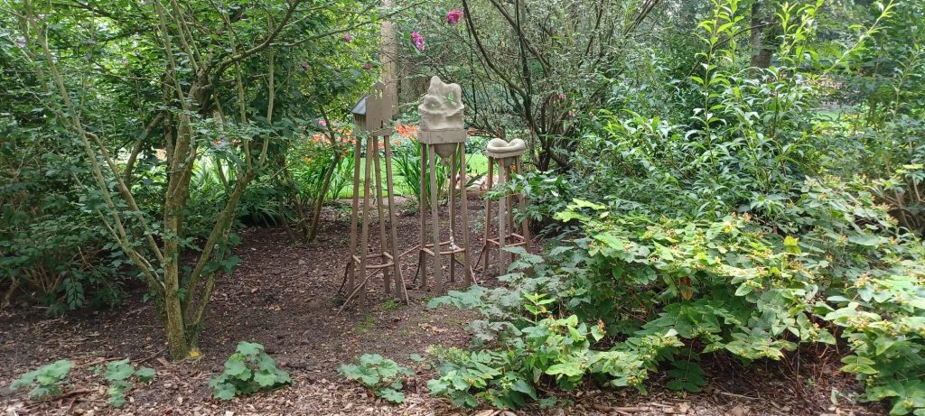 Verscholen tussen het groen liggen twee houten beelden gemaakt door Pip Passchier. De beelden