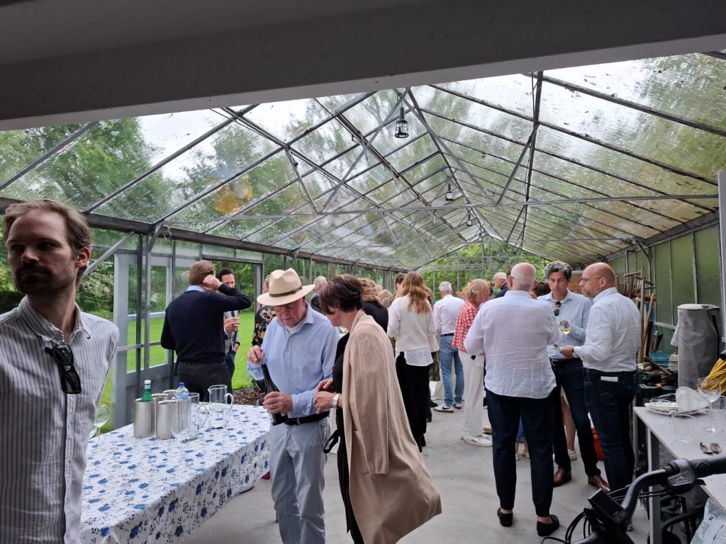 De sfeer was levendig. Het weer was spannend. We begonnen droog en met een zonnetje, maar tegen het einde toen er nog circa de helft van de bezoekers waren, moesten wij voor de regen onze plantenkas invluchten. Daar werden de sociale contacten aangehaald onder het genot van meer hapjes en drankjes. We hebben tijdens deze opening twee werken verkocht.