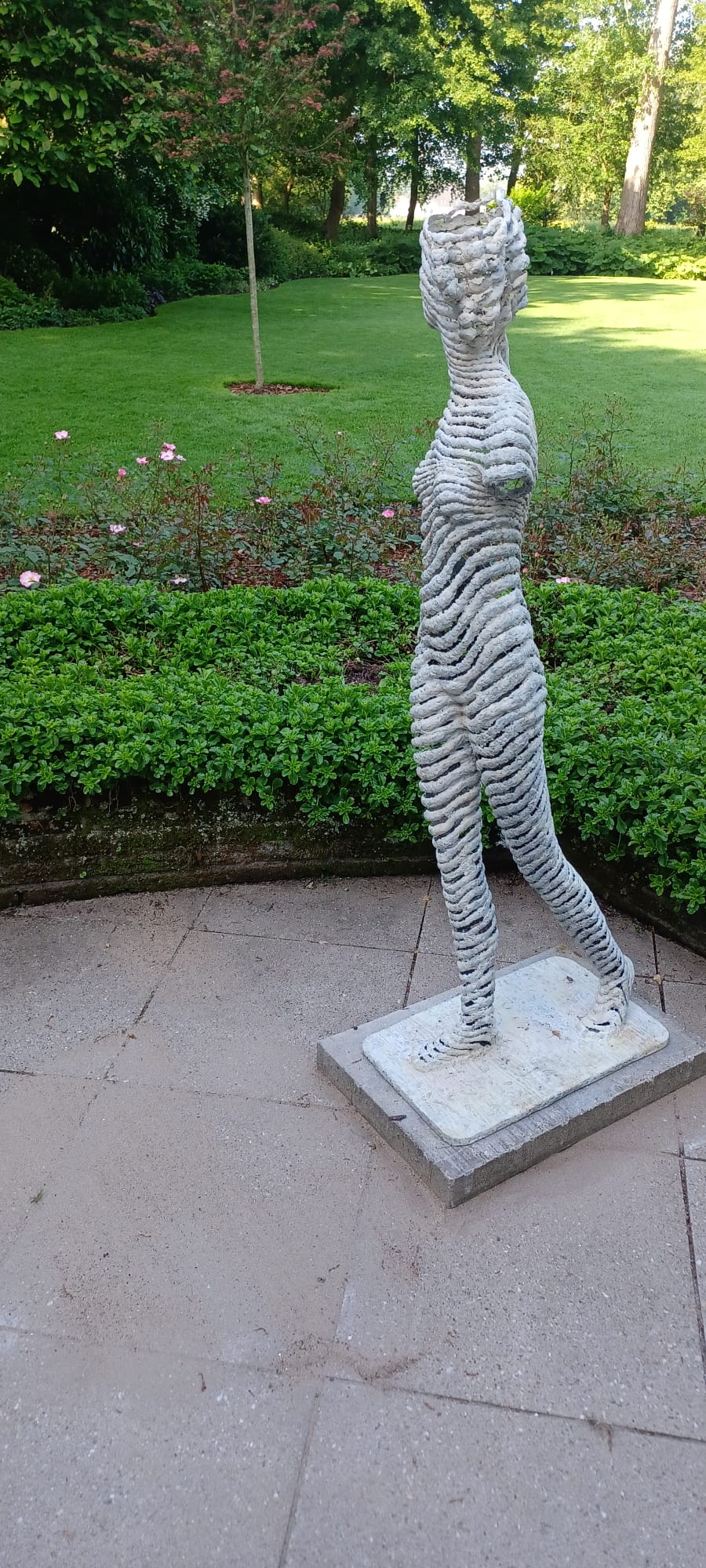 José Jonkers — ‘Tuin der Lusten’ is één van de opvallende werken van deze beeldend kunstenaar. Het is geïnspireerd op de organische fonteinen uit het gelijknamig drieluik schilderij van Jeroen Bosch en gemaakt van aluminiumcement. Een ander intrigerend beeld maakte ze van door vulkanen uitgestoten turfsteen en een paardenhalster, gevonden langs het Pieterpad. De steen is zo bewerkt dat het lijkt alsof het halster er al jaren omheen gekneld zit.