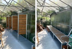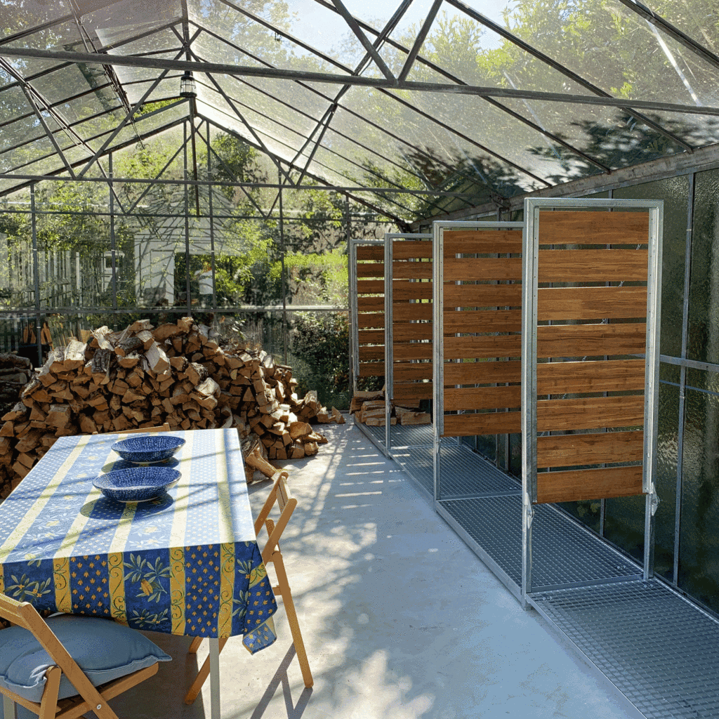 Eens in de zoveel tijd moet er eentje gerooid worden vanwege de slechte staat van de boom en om plaats te maken voor nieuwe aanplant. Het gevolg: een grote hoeveelheid haardhout en een behoefte aan veel opslagruimte om het hout te drogen. De voormalige tuinkas heeft voldoende ruimte voor opslag maar wordt door de familie ook intensief gebruikt als tuinkamer, speelkamer en expo ruimte. Alle reden om de houtopslag zo te ontwerpen dat deze geen afbreuk doet aan bovengenoemde functies.