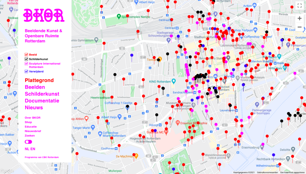“Met een beetje vertrouwen zijn de weergoden ons goed gezind de komende maand en kunnen we weer eens een beetje buiten lopen. Wat is er dan fijner om je eigen stad te verkennen aan de hand van de openbare kunst die ruimschoots aanwezig is in Rotterdam? Kijk, verbaas je en geniet!! Maak je eigen kunstroute aan de hand van de plattegrond van het BKOR / CBK* waar (bijna) alle openbare kunst van Rotterdam te zien is”.