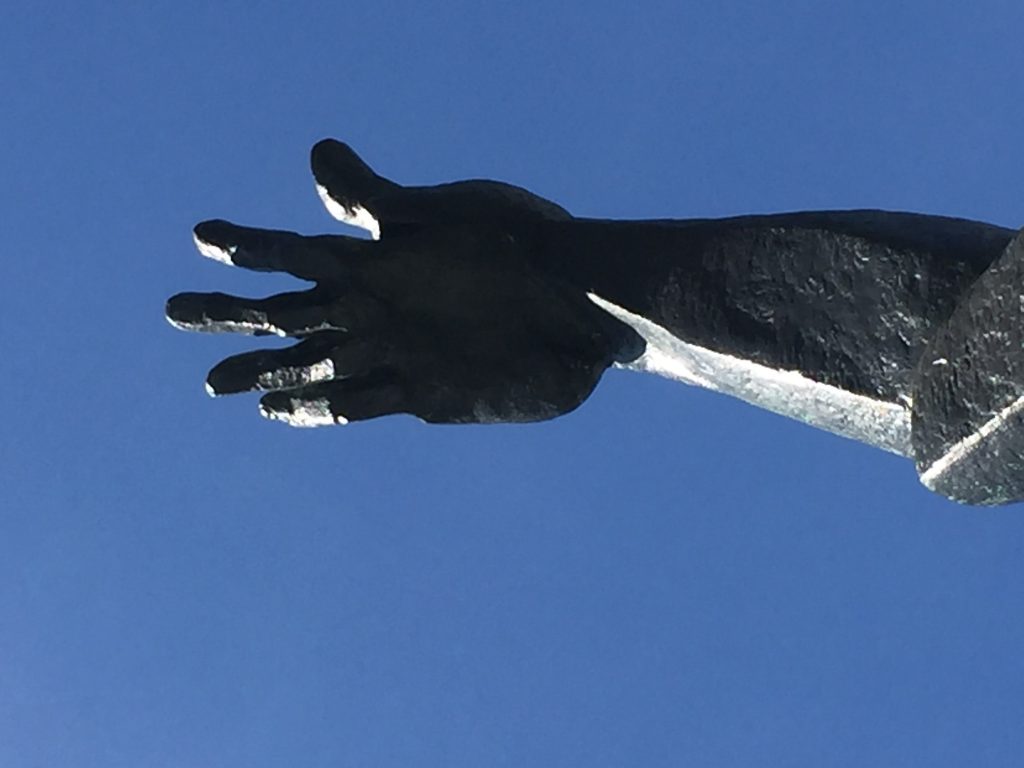 Herman vertelt, op anderhalve meter, over zijn kunst en eigenlijk ook over het feit dat hoewel hij door zijn leeftijd als docent op de Kunstacademie met pensioen moet gaan, hij nog steeds ontzettend veel plezier heeft in het maken van kunst. Ook in het exposeren ervan. Een bijzonderheid is, is dat hij in zijn lange carrière nog nooit een expositie heeft gehad zoals bij ons. Hij maakte meestal werk in opdracht. Nu is het vrij werk dat het publiek kan kopen. Hoewel er door het coronavirus geen bijeenkomst van een groot publiek geweest is, was er wel tijdens een individueel bezoek van vrienden van ons belangstelling voor het bronzen beeldje 1944. Het ziet er prachtig en grappig uit aan heel lange oranje bretels aan een boom.