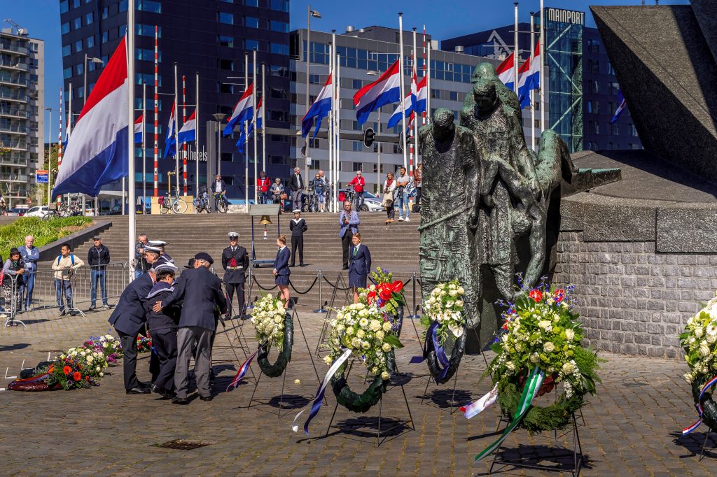 Het is bijzonder spijtig dat ook onze bijeenkomst op 4 mei niet door kon gaan. In de planning stond op het tijdstip van verzending van deze nieuwsbrief een wandeling onder leiding van filosoof Jan de Bas langs diverse plekken in de stad, waar het verhaal over het Bombardement van 14 mei, WO II en 75 jaar Bevrijding verteld zou worden. Vertrekpunt zouden de trappen bij de Vlaggenparade zijn, naast het nationaal monument ‘De Boeg’. Jaarlijks is daar om 10.30 uur de Herdenking voor de omgekomen Nederlandse zeevarenden van de koopvaardij. Om misverstanden te voorkomen: de foto hieronder is uit 2018.