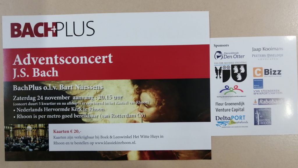 Op zaterdag 24 november werd het Adventsconcert – J.S. Bach door het BachPlus ensemble uitgevoerd onder leiding van Bart Naessens in een druk bezochte Nederlands Hervormde Kerk in Rhoon. Dit was het laatste concert van Klassiek in Rhoon 2018. Mocht u interesse hebben in het programma 2019 van Klassiek in Rhoon, kijk dan op de website.