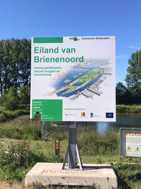 Als u over het bijzondere bruggetje (dat overigens met verdwijnen wordt bedreigd) loopt, ziet u een bord in de gemeentelijke huisstijl met plannen over de aanleg van een getijdenpark.