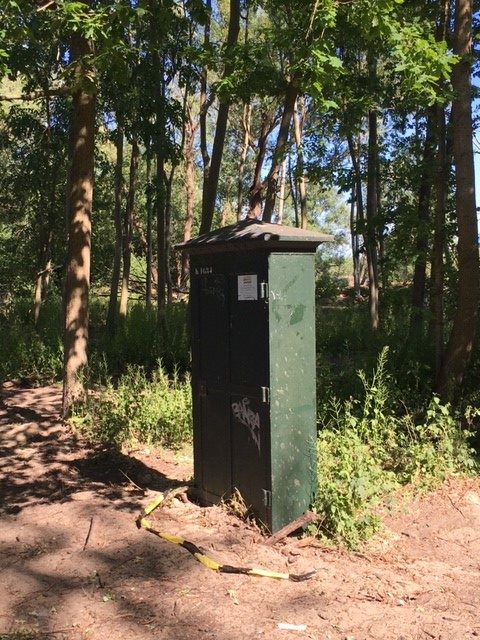 Ga voor het bord naar rechts en loop / fiets tot u de groene elektriciteitskast (hieronder) ziet aan de rechterkant van het pad. Hier gaat u naar links en dan ziet u vanzelf het hek van de Buitenplaats.